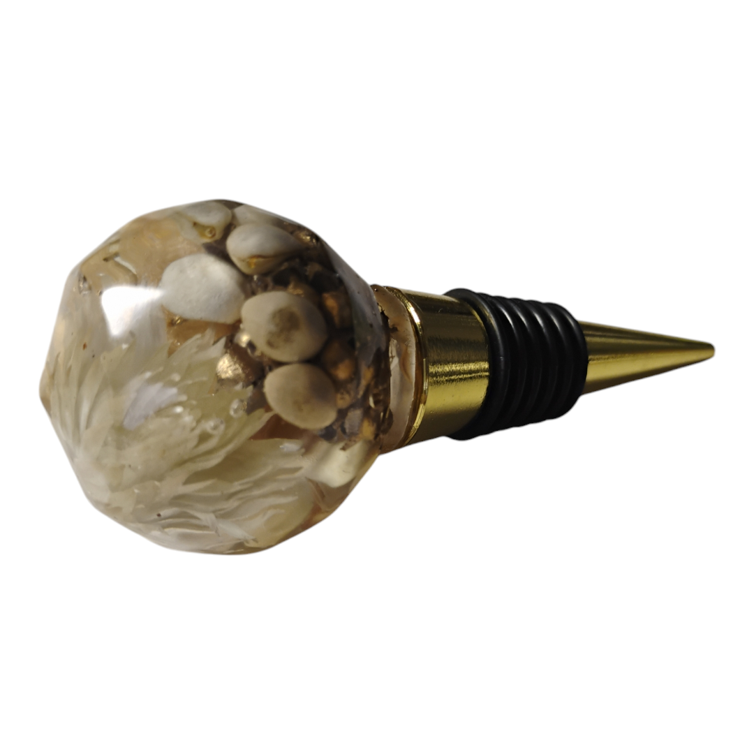 Bouchon de bouteille universel en résine époxy avec inclusion de fleurs séchées.