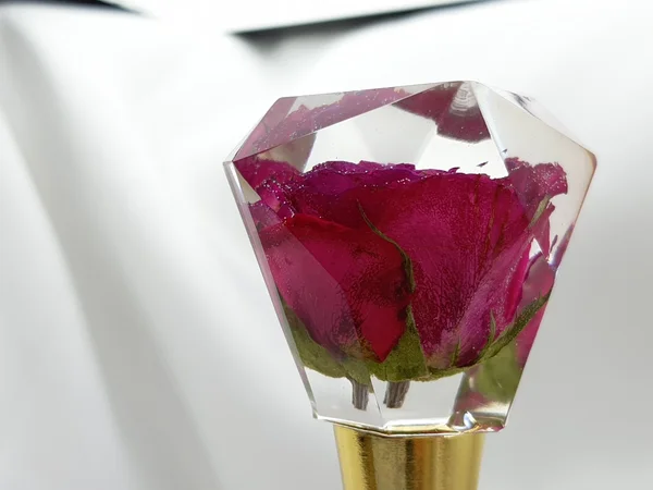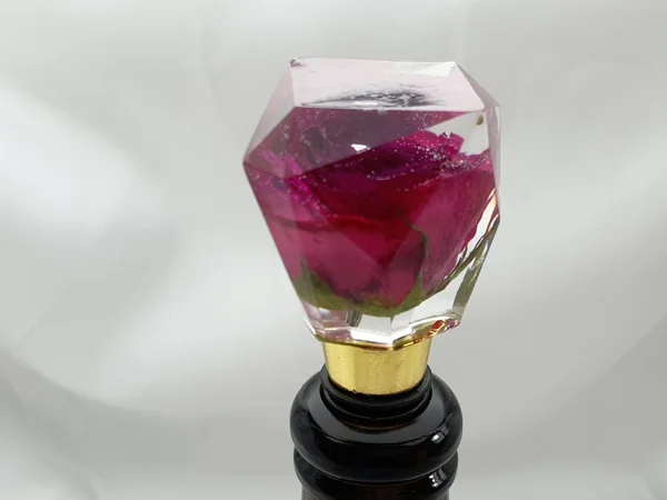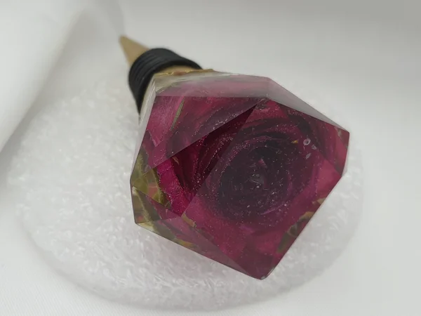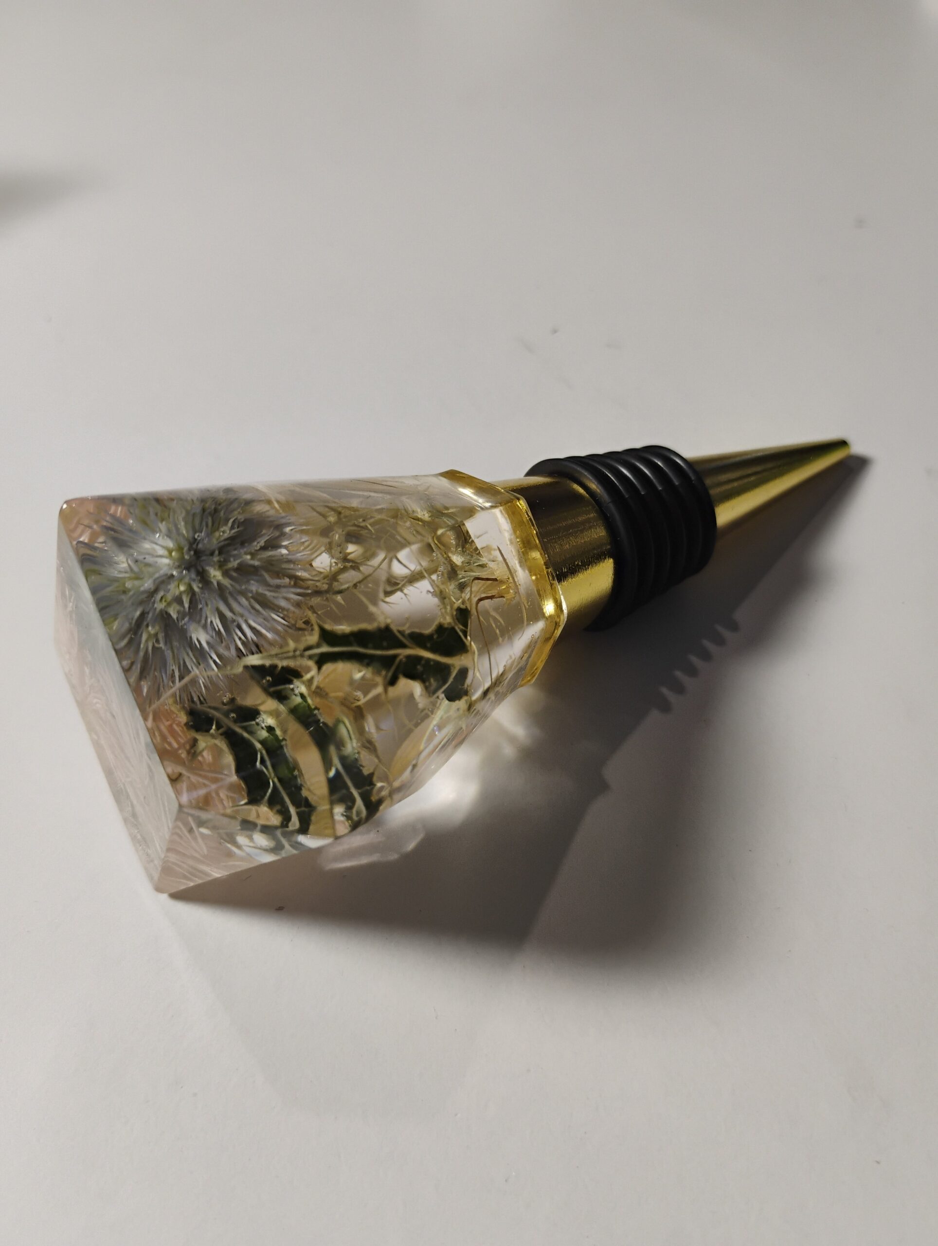 Bouchon de bouteille universel en résine époxy avec inclusion de fleurs séchées.