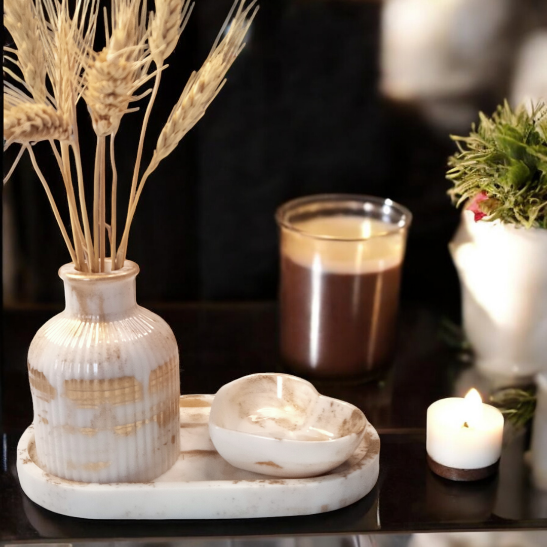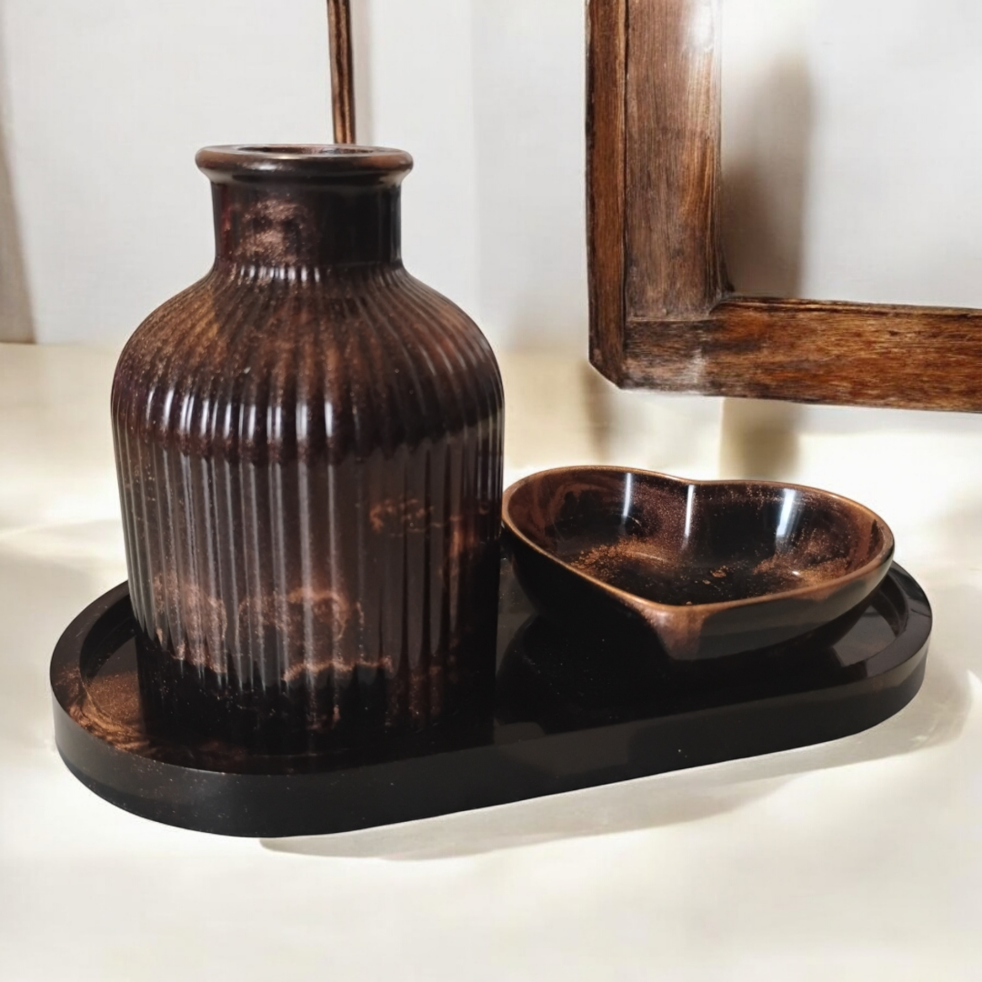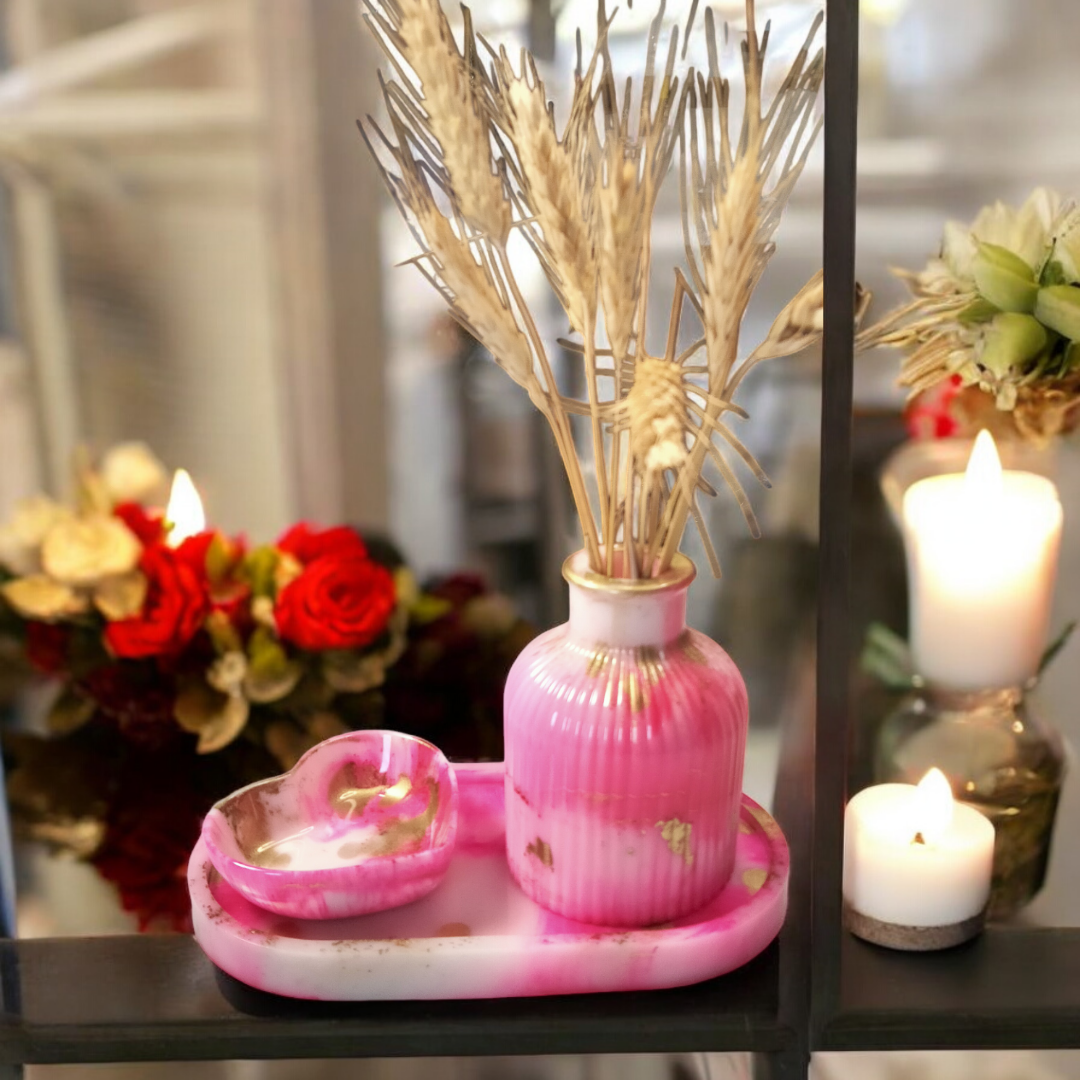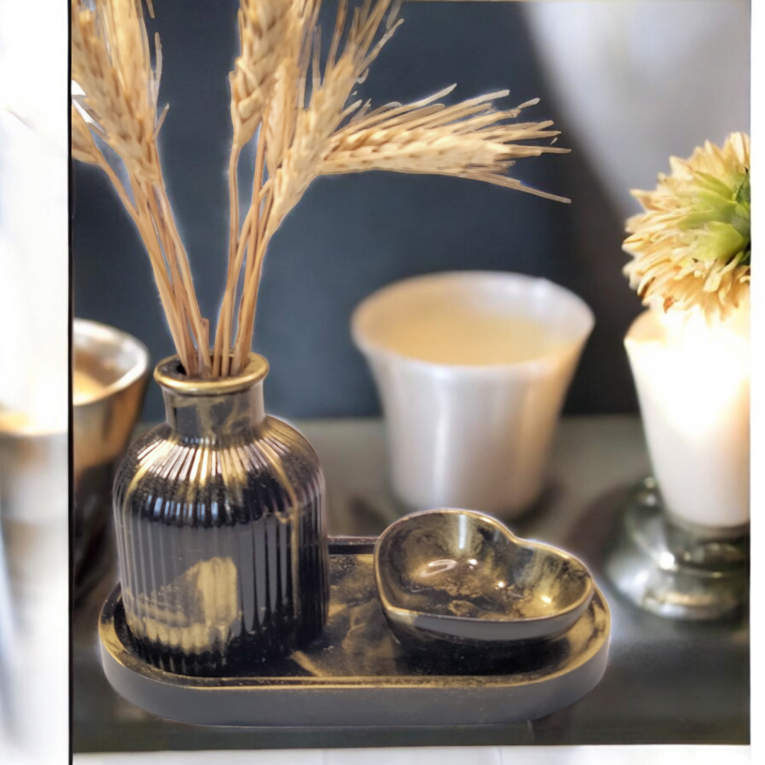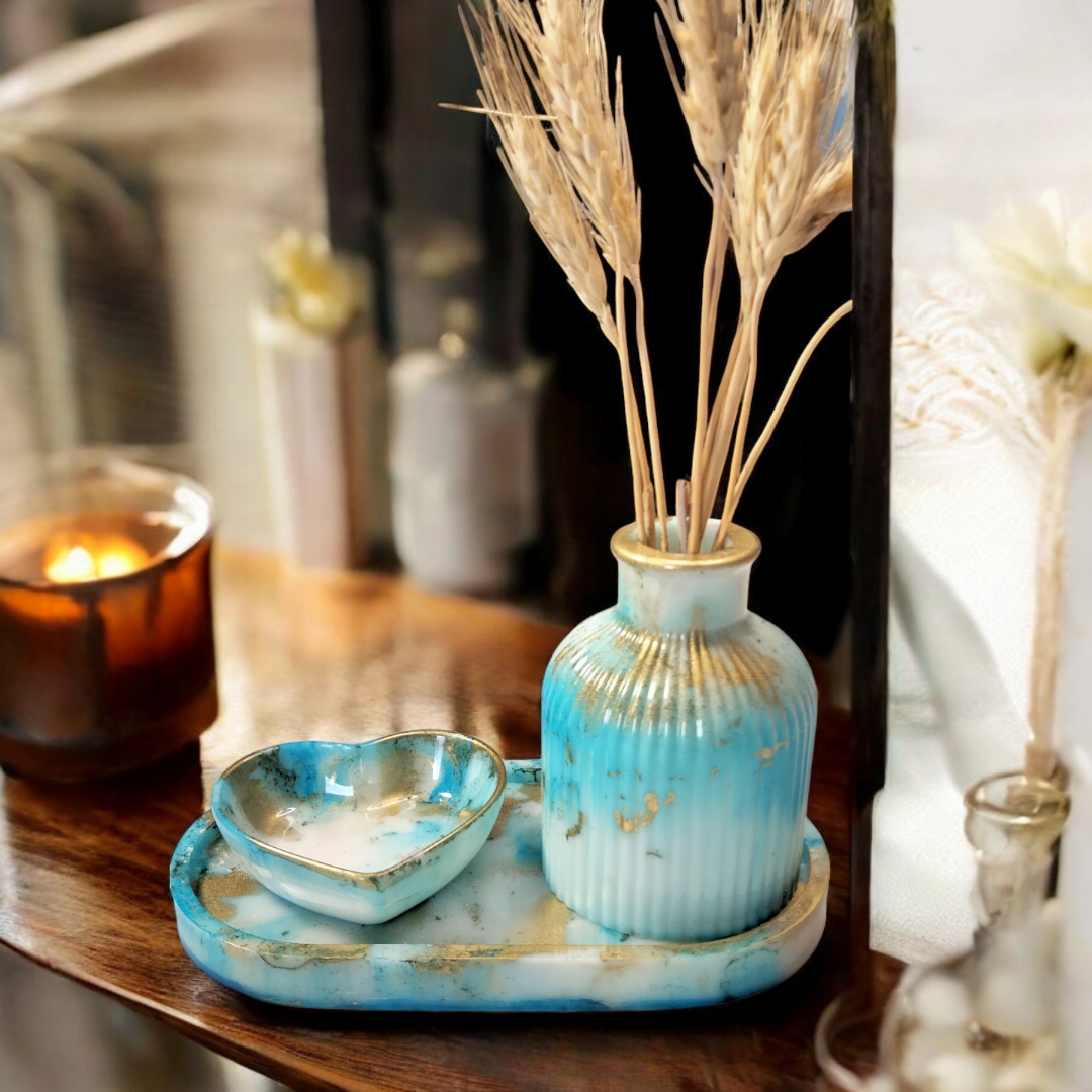 Ensemble décoratif en résine époxy comprenant un plateau, un soliflore et un petit vide poche cœur.