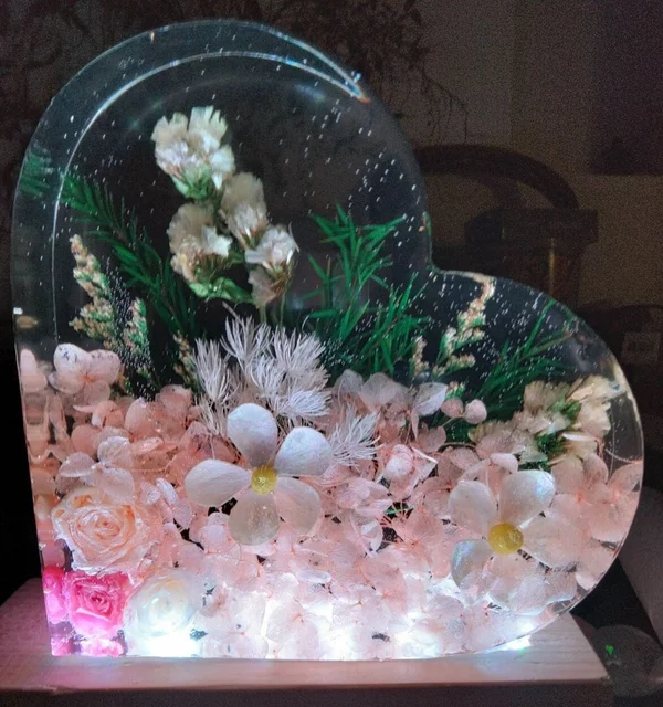 Cette lampe coeur florale en résine époxy avec inclusion de fleurs séchées est livrée avec son support en bois avec ruban led RGB intégré et se branche directement sur votre prise.