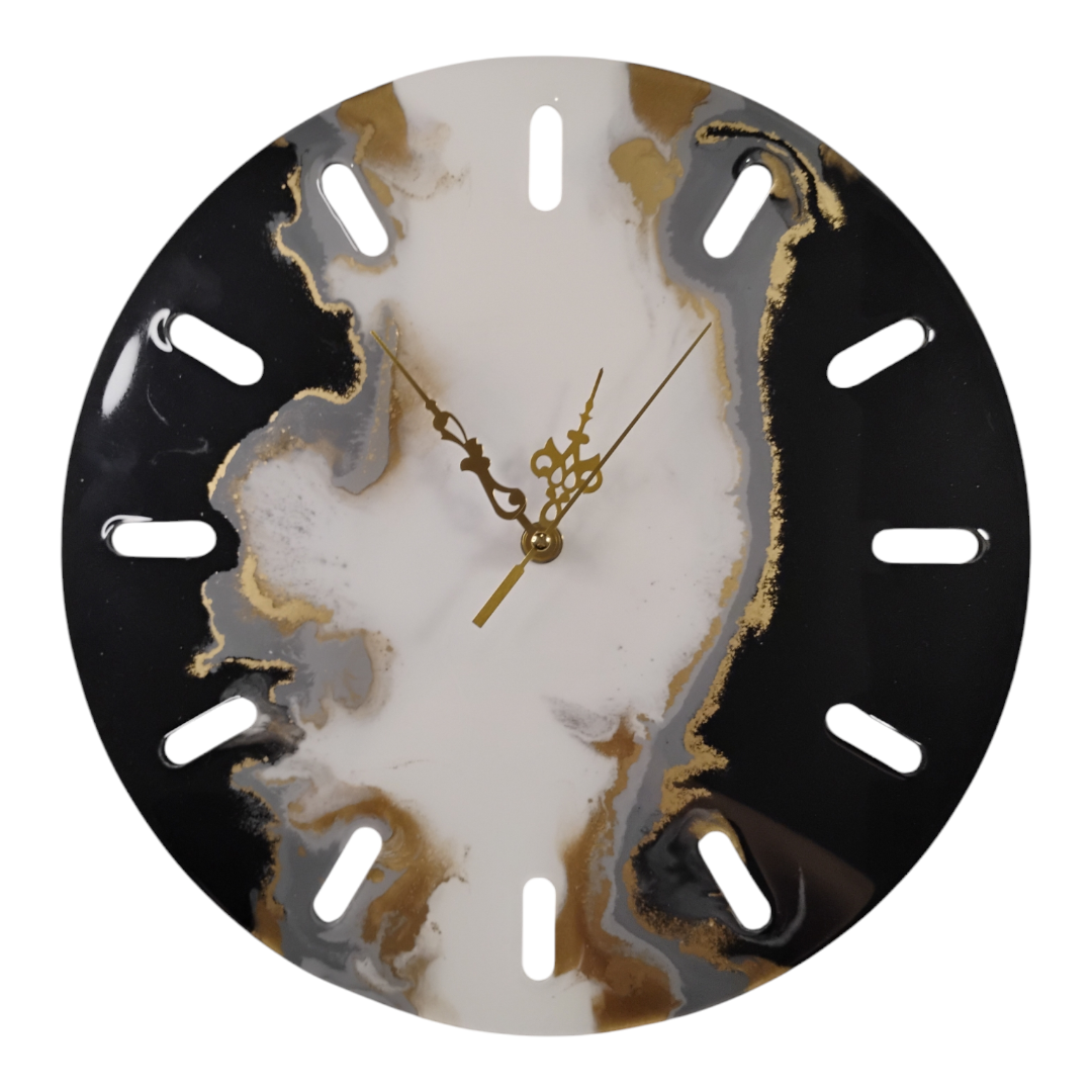 Horloge de diamètre 30cm en résine époxy de couleur noir, gris, blanc et or.