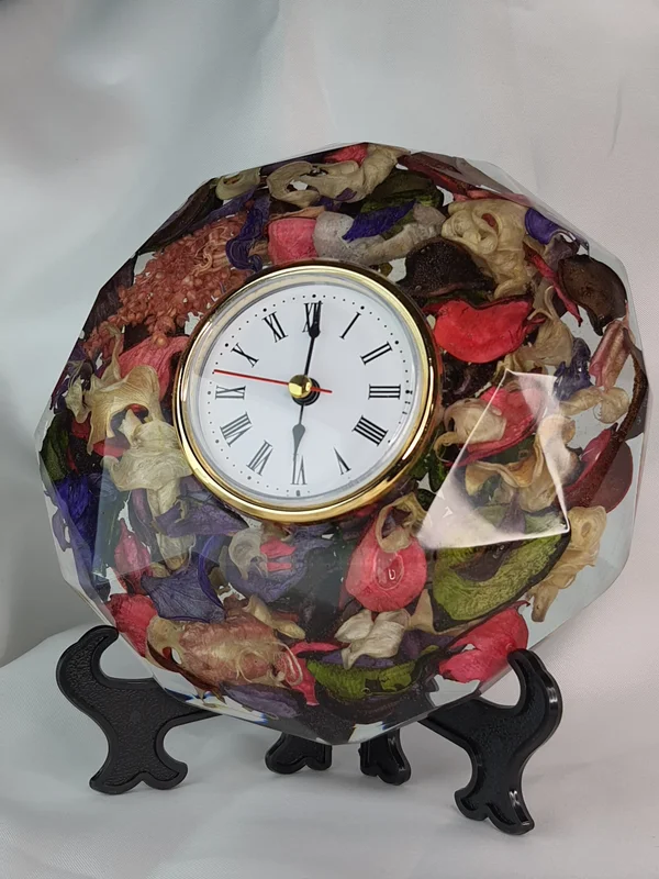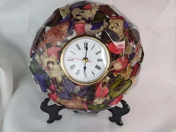 Horloge vintage en résine epoxy avec inclusion de diverse écorces style « pot pourri ».