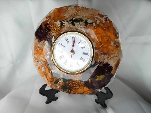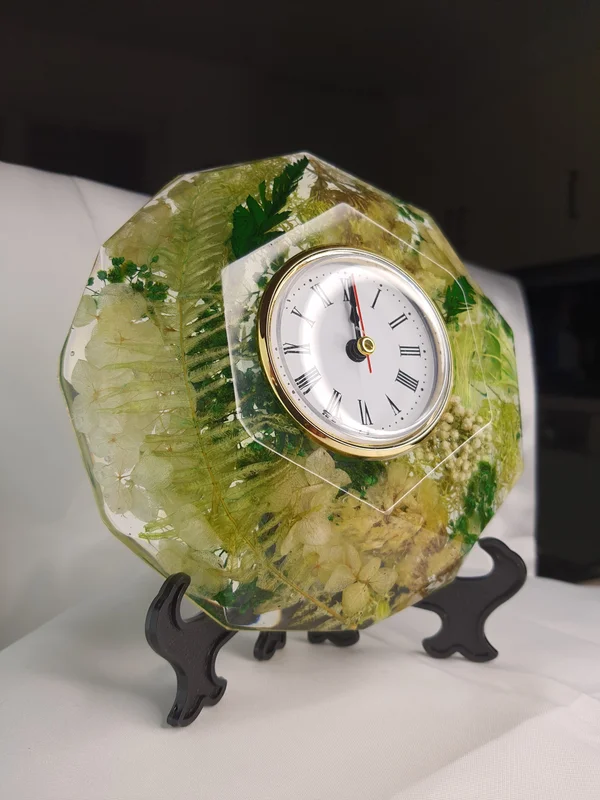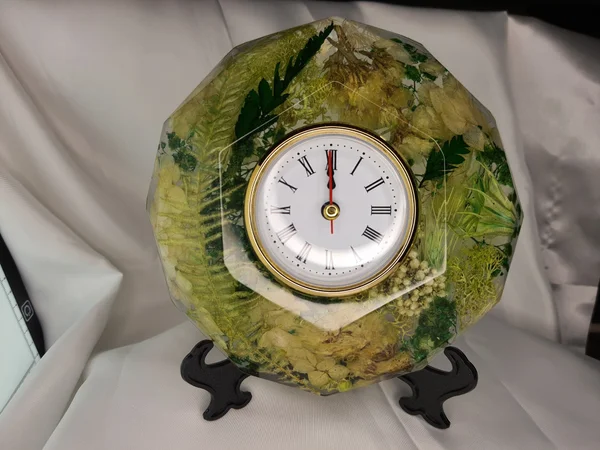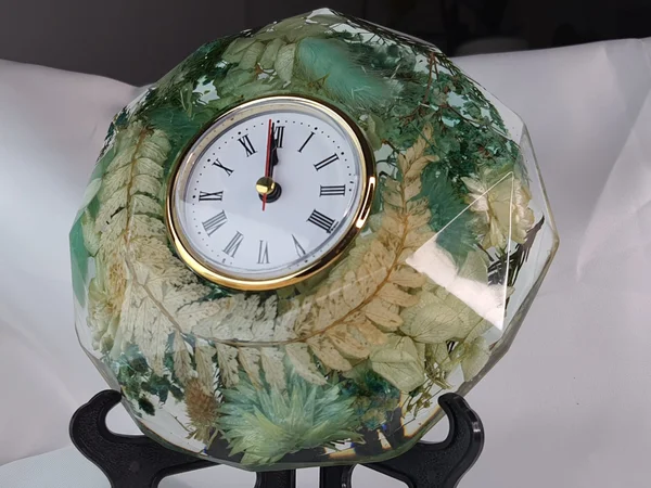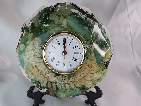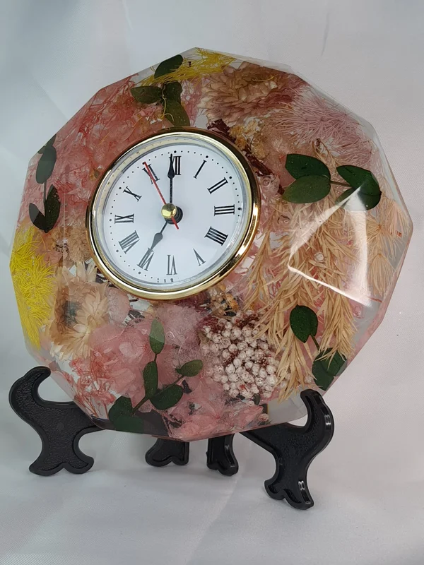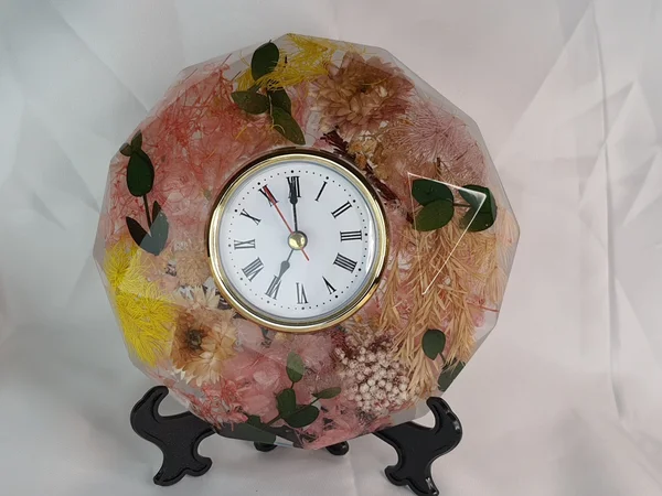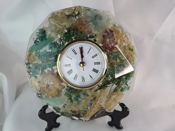 Horloge vintage en résine epoxy sur pied avec inclusion de fleurs séchées.