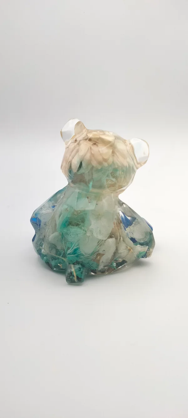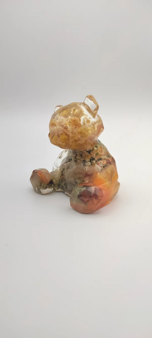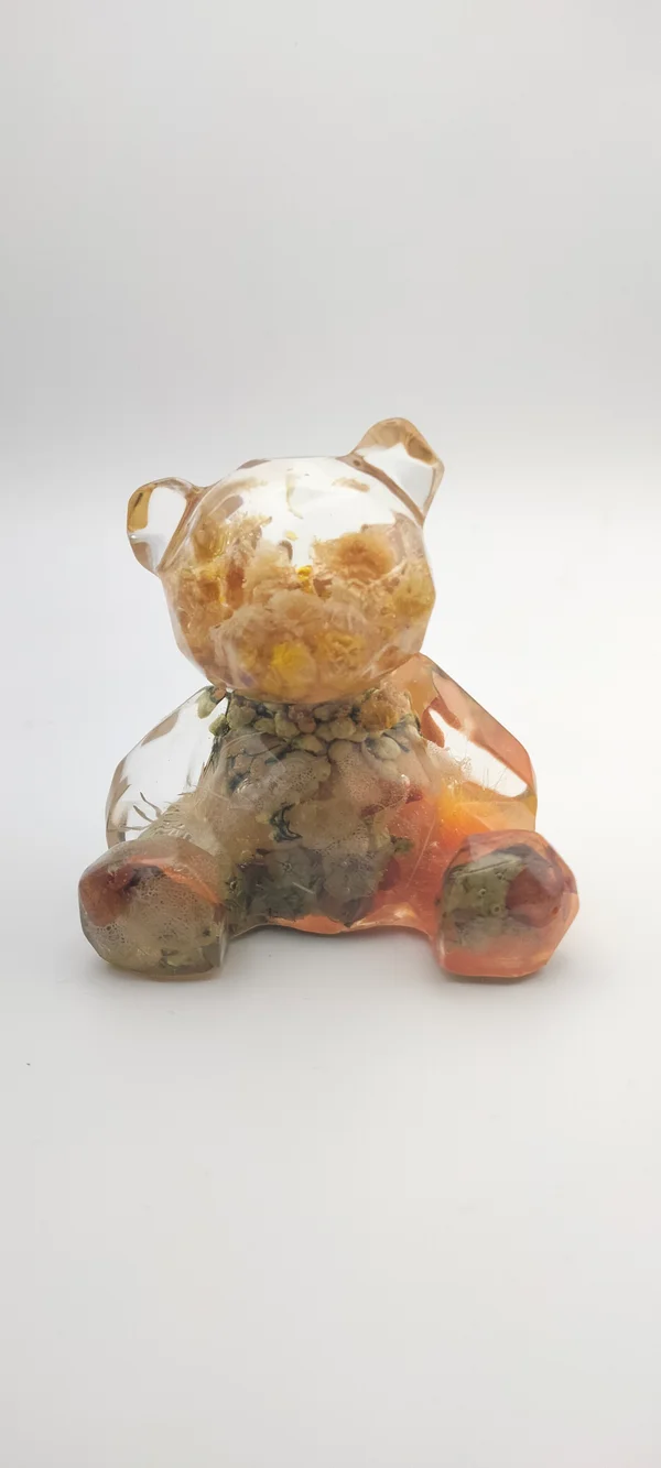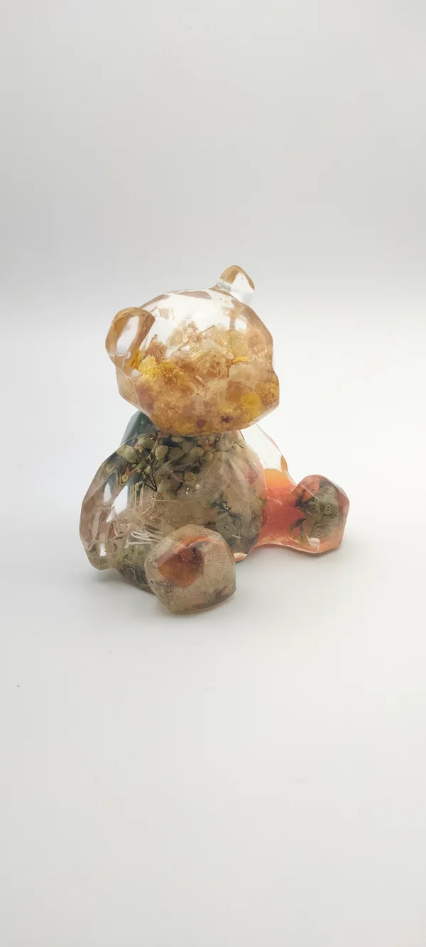 Ourson décoratif en résine époxy avec inclusions de fleurs séchées.