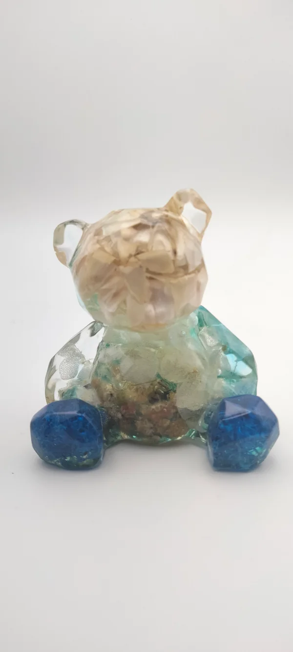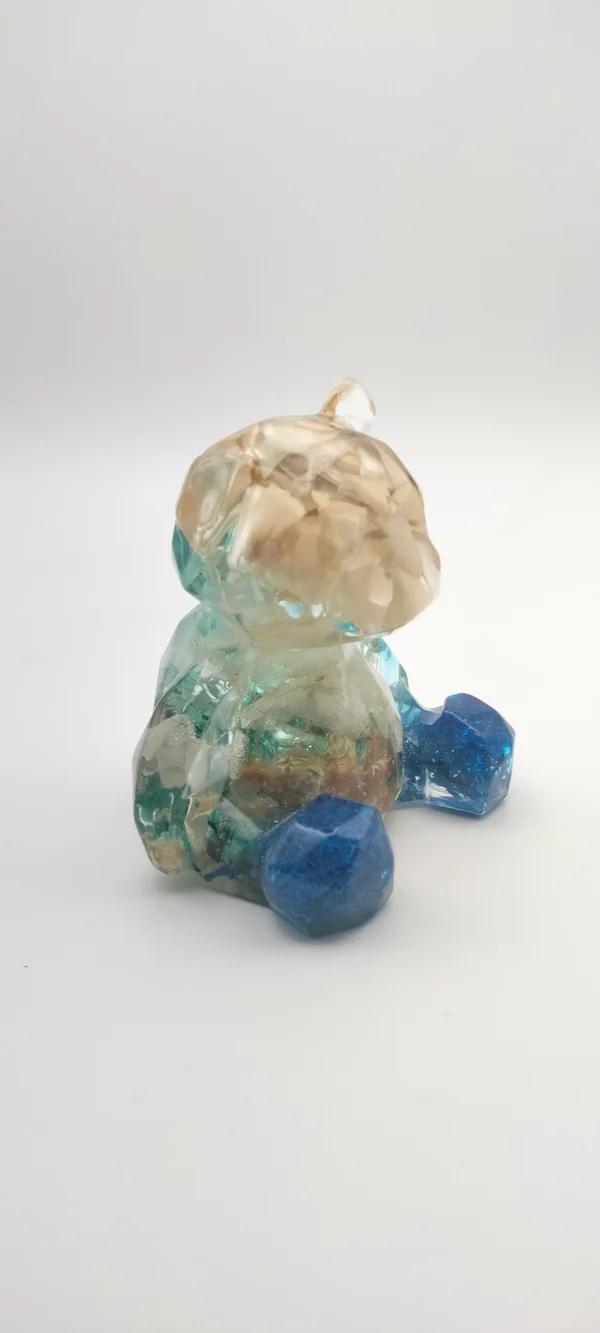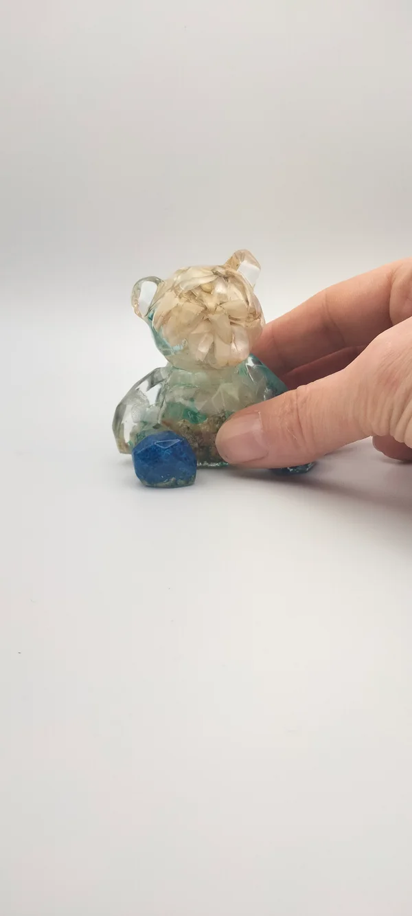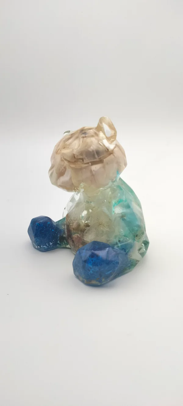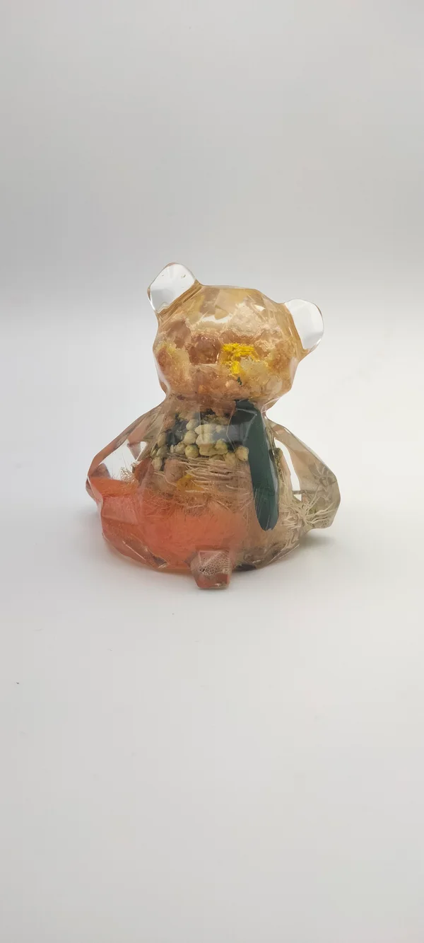 Ourson décoratif en résine époxy avec inclusions de fleurs séchées.