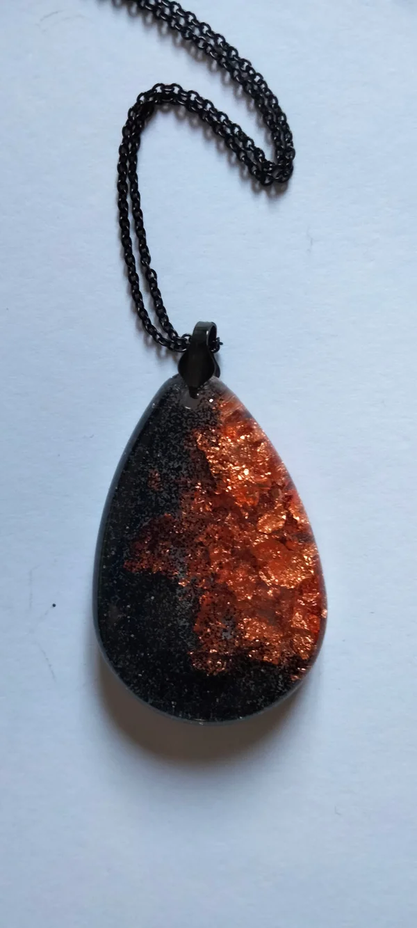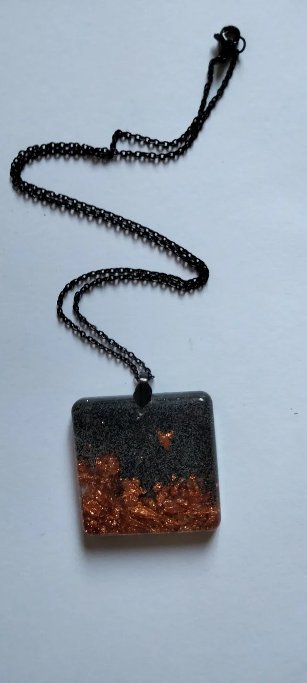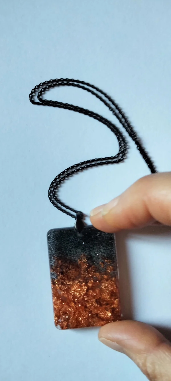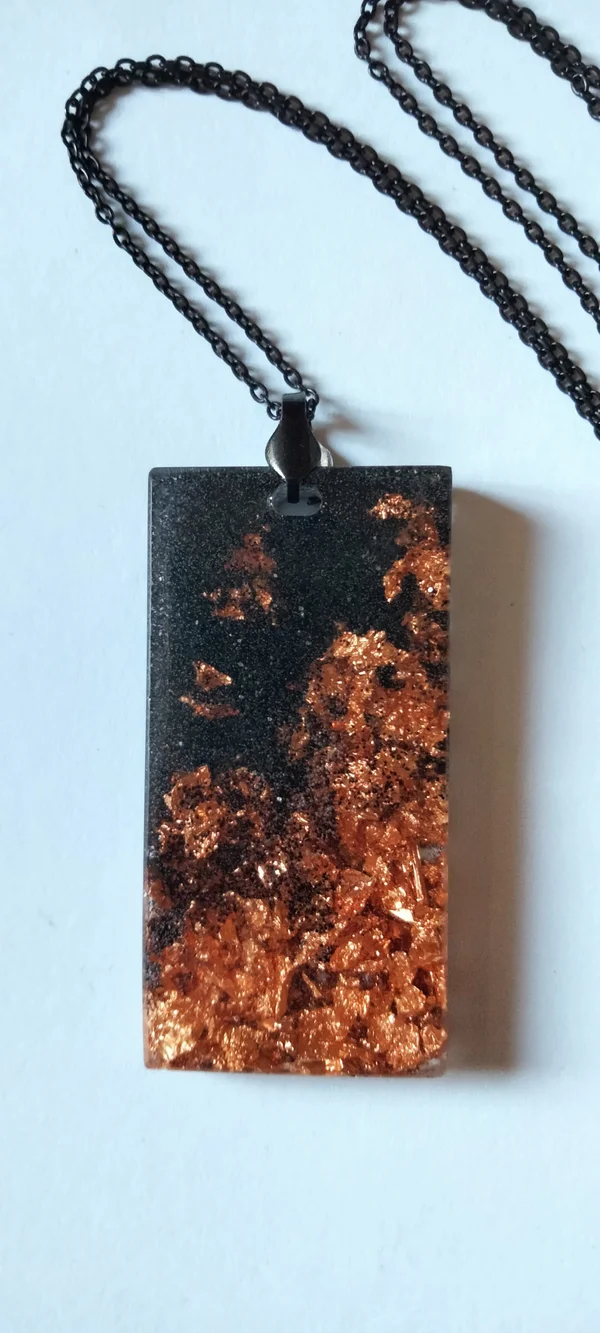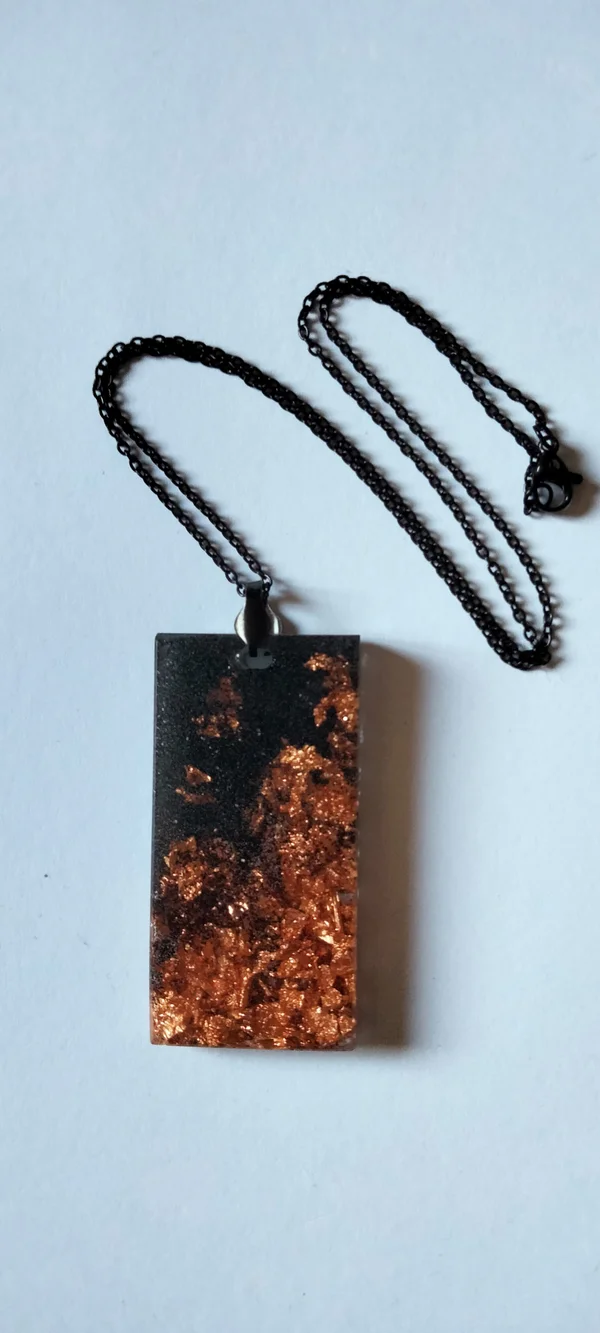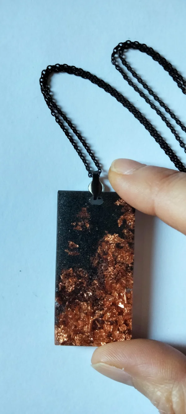 Pendentifs en résine époxy avec inclusion de poudre de mica noir et de feuilles métalliques cuivrée.