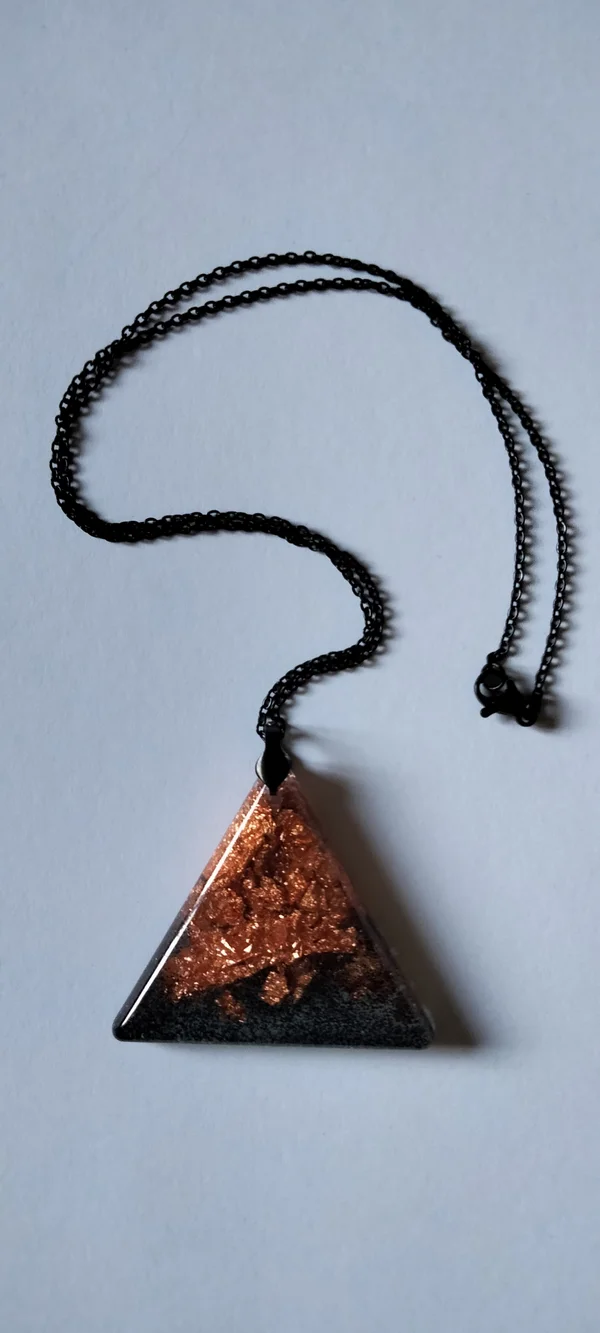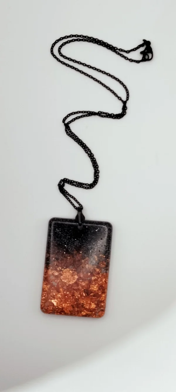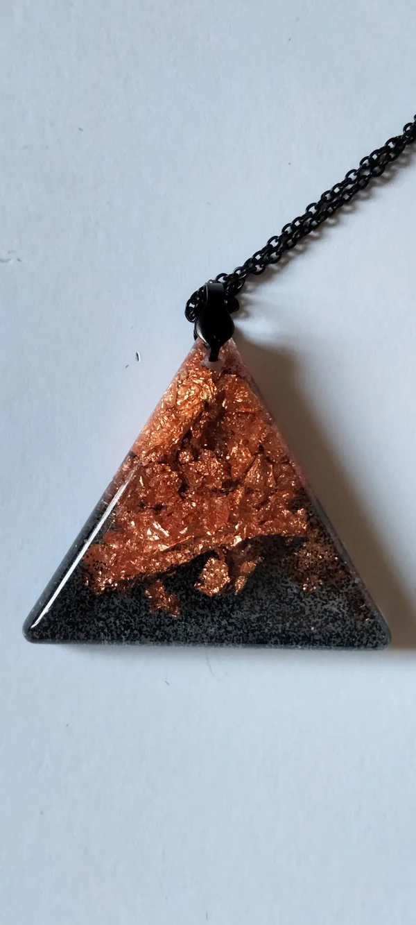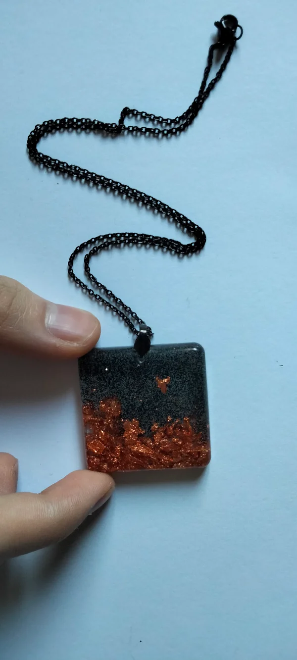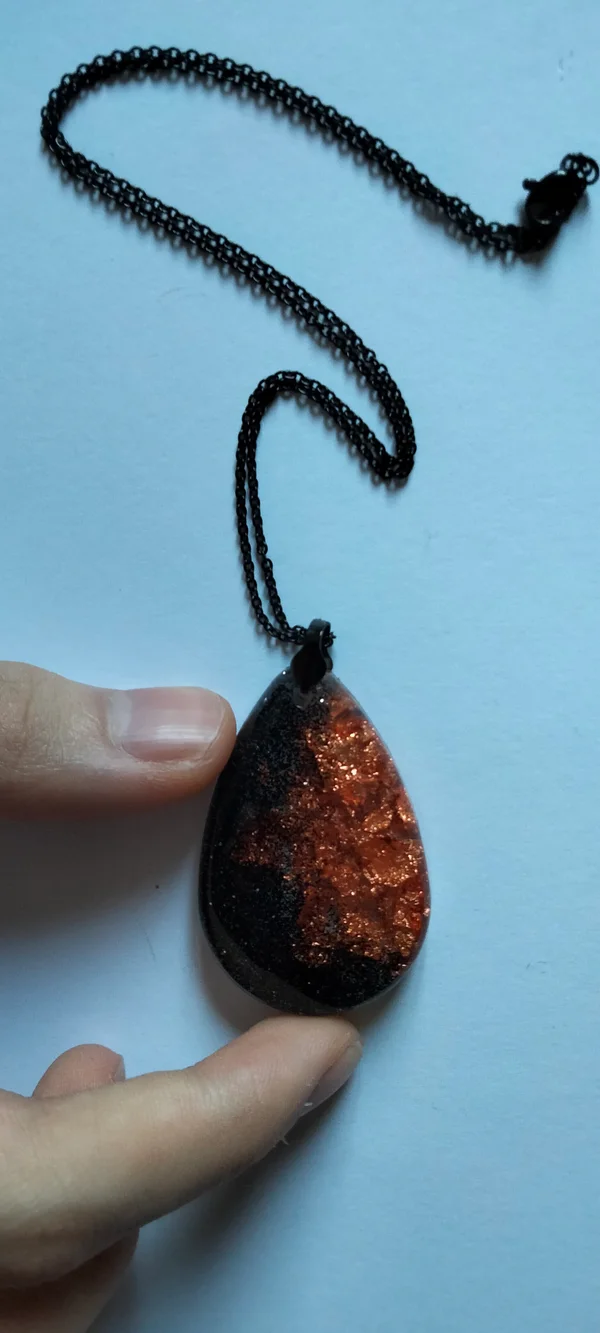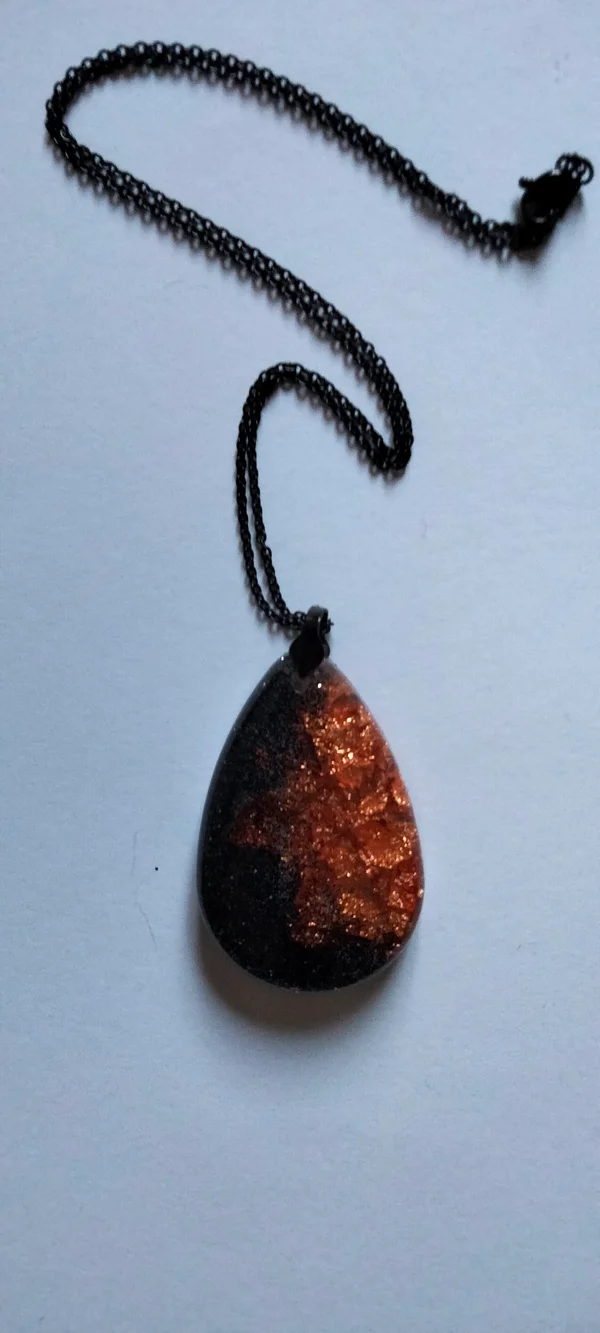 Pendentifs en résine époxy avec inclusion de poudre de mica noir et de feuilles métalliques cuivrée.