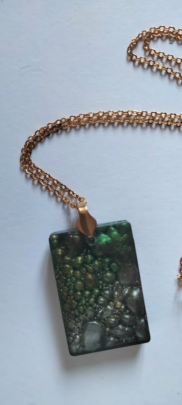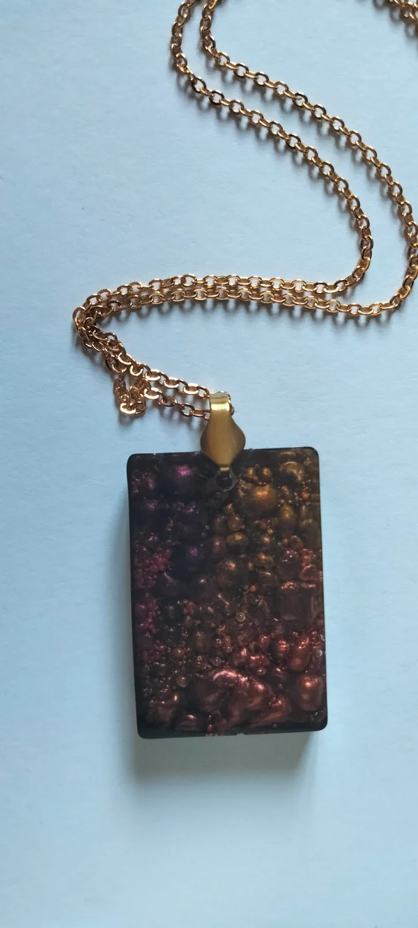 Pendentifs en résine epoxy et UV avec inclusion de colorant noir et poudre de mica.