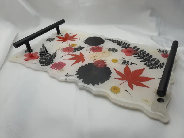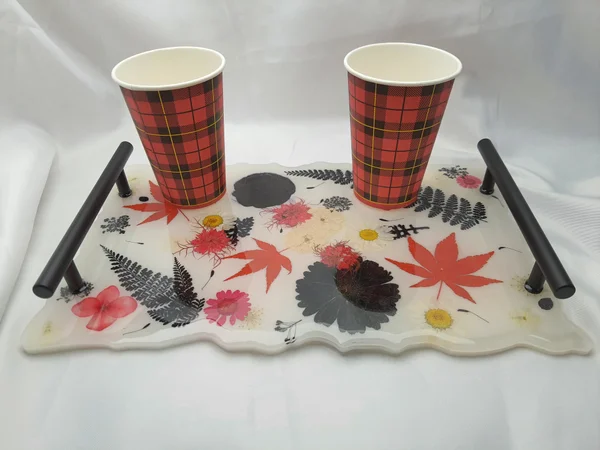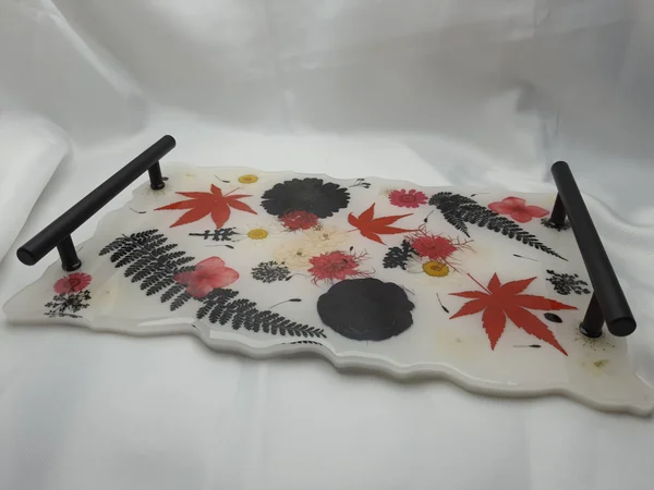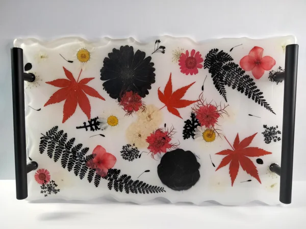 Plateau en résine chic avec inclusion de fleurs et feuilles séchées de couleurs vives et colorant.