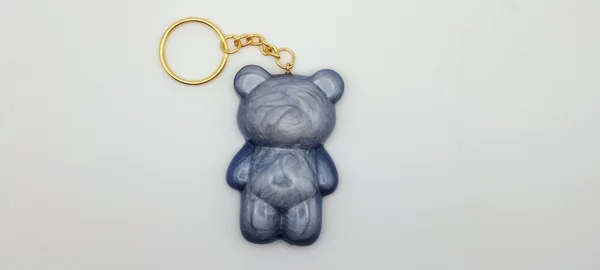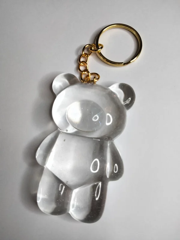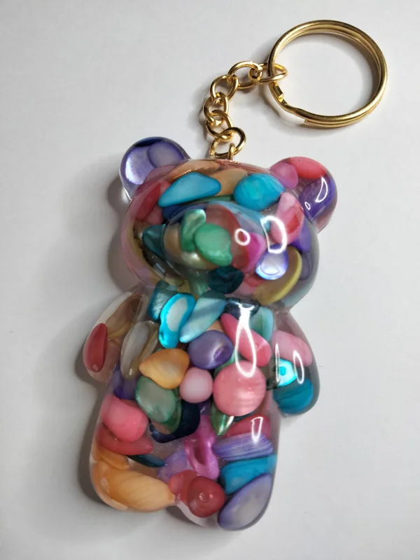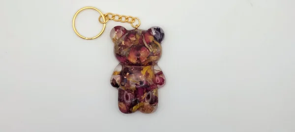 Porte-clés nounours en résine avec inclusion de pétales de rose, de pierres nacrées, de colorant ou effet « cristal »