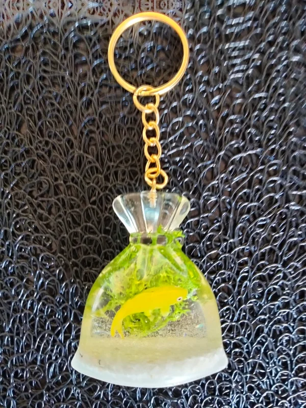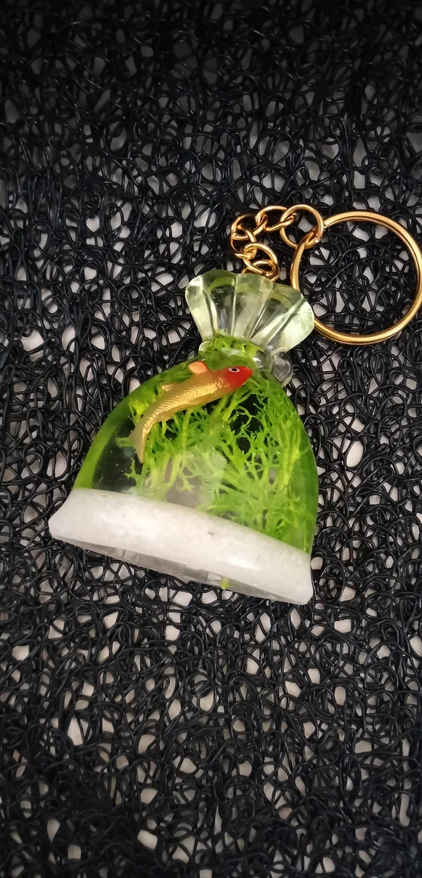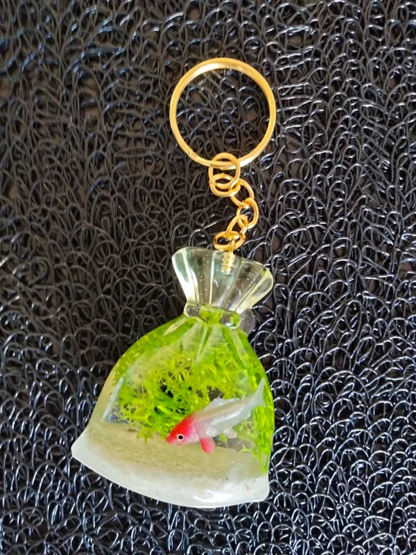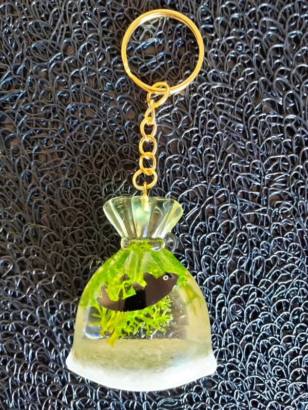 Porte clés « Poisson rouges »en résine époxy avec inclusion de sable, d’un poisson en plastique et de zeechium.