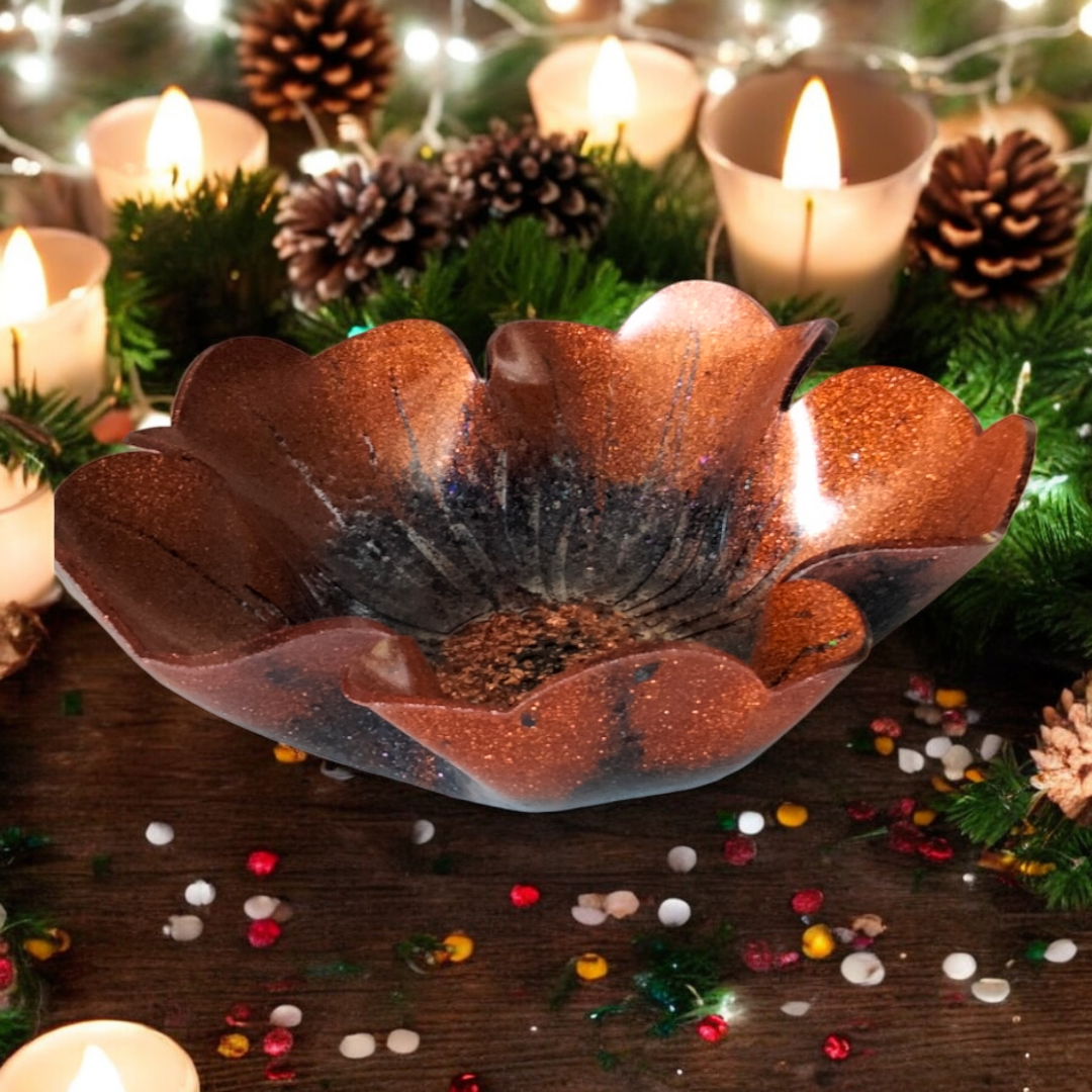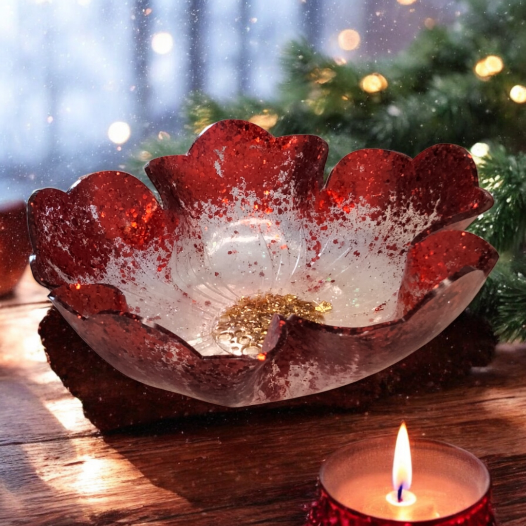 Saladiers fleurs en résine époxy avec inclusion de paillettes.